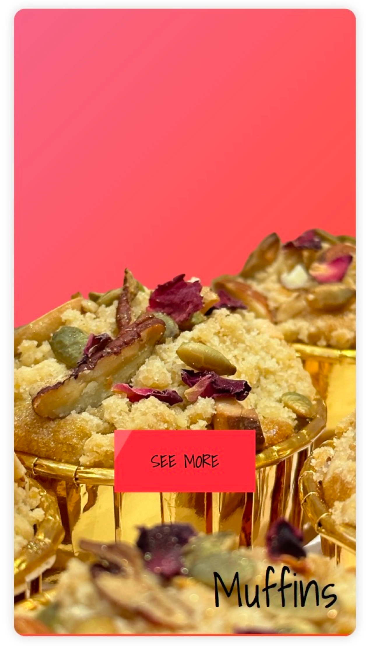 Customers are welcomed by three engaging panels that gracefully animate upon interaction, enticing exploration with just a click. Each panel offers a charming display of past orders, featuring a tempting assortment of treats like cakes, muffins, and delightful cake pops. Leveraging JavaScript, these panels dynamically respond to hover actions, adding an interactive flair to the browsing experience. Additionally, hovering over the "See More" button triggers another JavaScript animation, smoothly expanding the selection to reveal more mouthwatering pictures of the offerings.